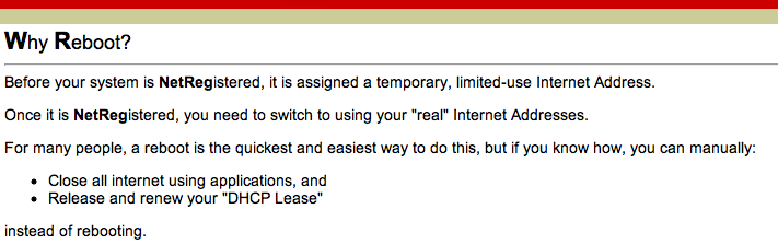 And that fast, I've completely reversed my opinion of them. They're right! For the majority of users, rebooting is both simplest to explain and simplest to do—and if they're not power users they're unlikely to have any long-running tasks that would be fouled up by a reboot. And, for the power users, ISU's tech folks have helpfully clarified that yes, a simple release-and-renew is all that's actually required, and if you know what that means, you can do that and not worry that some wonky setting somewhere will break anything. So they've effectively navigated the "easy for novices, effective for experts" divide that is sometimes so tricky. (And in fact I had internet all weekend with no troubles at all.)